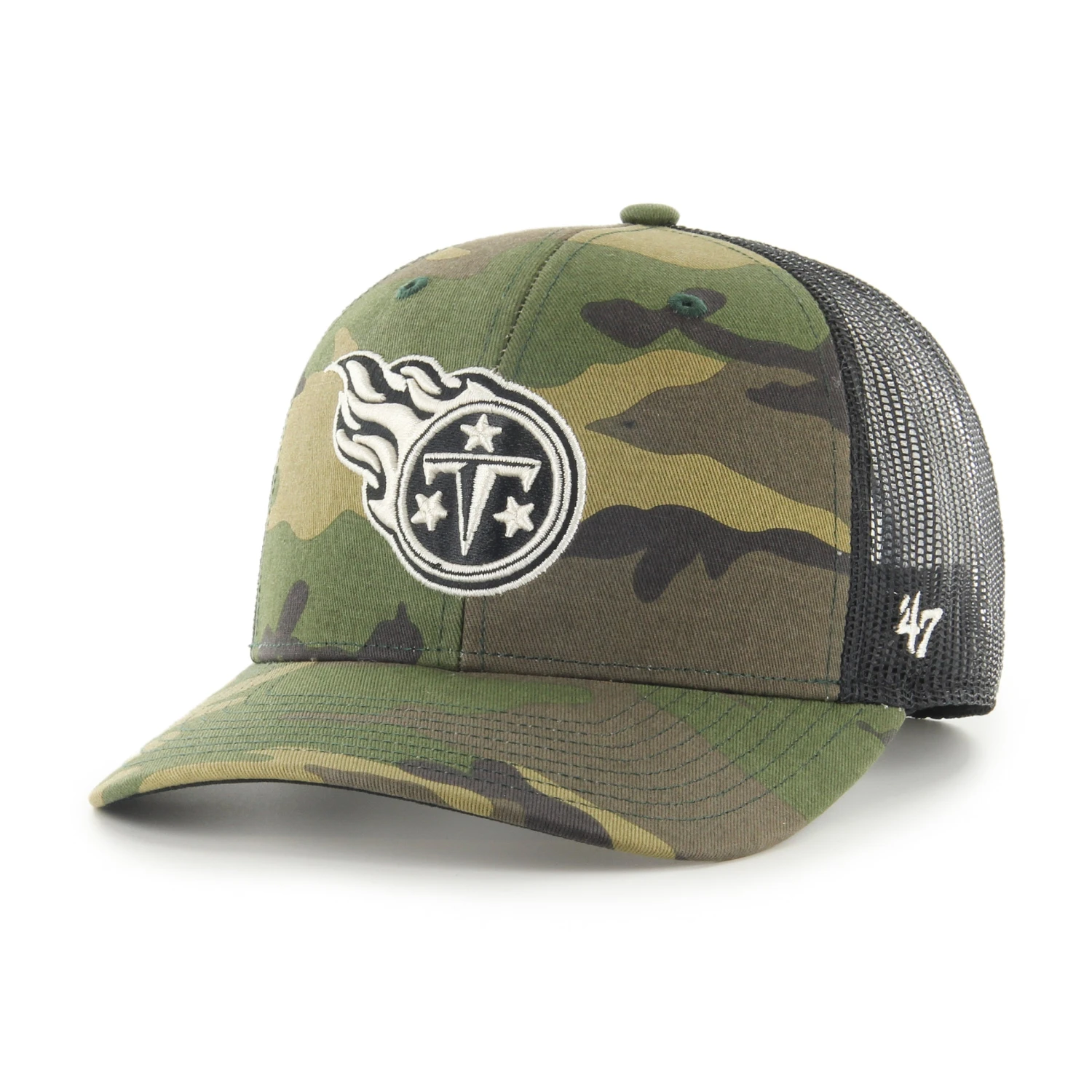 The Camo Strap ’47 TRUCKER has a comfortable mid-crown, a curved visor, and an adjustable velcro closure. The front has a raised embroidery logo. Made from garment washed cotton twill and mesh.